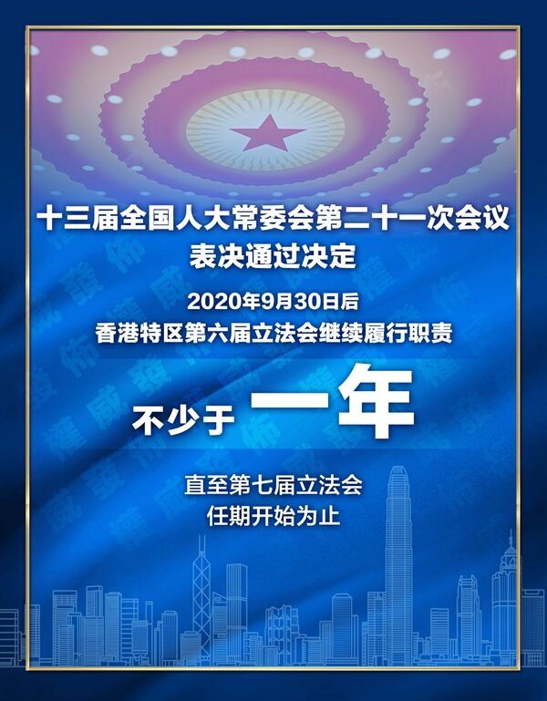 第十三届全国人民代表大会常务委员会第二十一次会议审议了《国务院关于提请全国人民代表大会常务委员会就香港特别行政区第六届立法会继续运作作出决定的议案》。上述议案是应香港特别行政区行政长官向中央人民政府报送的有关报告提出的。香港特别行政区行政长官会同行政会议因应当地新冠肺炎疫情的严峻形势已决定将香港特别行政区第七届立法会选举推迟一年,在此情况下香港特别行政区立法机关将出现空缺。为维护香港特别行政区宪制秩序和法治秩序,确保香港特别行政区政府正常施政和社会正常运行,根据《中华人民共和国宪法》和《中华人民共和国香港特别行政区基本法》的有关规定,全国人民代表大会常务委员会作出如下决定: