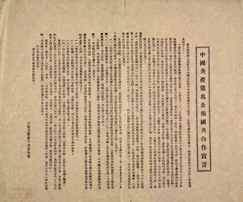 9月22日,国民党中央通讯社发表《中共中央为公布国共合作宣言》,第二天,蒋介石发表实际上承认共产党合法地位的谈话。国共两党重新合作,中国抗日民族统一战线正式形成。