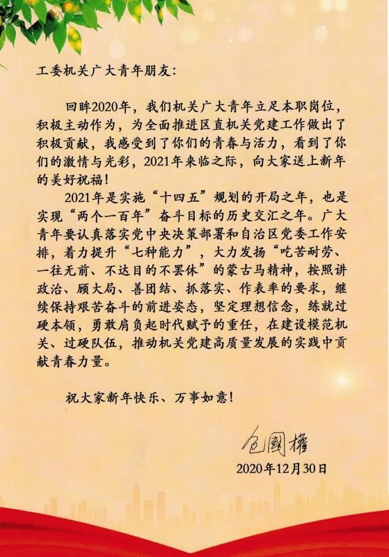 交流会上,包国权同志还为机关全体青年干部书写了新春寄语,为每位青年干部赠送了《习近平与大学生朋友们》《百年大变局》《从一大到十九大 中国共产党全国代表大会史》三本书籍,作为新年礼物。发言交流前,大家还集中学习了习近平总书记关于青年工作的重要论述。