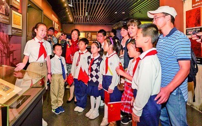 在中共一大会址纪念馆,一名“00”后讲解员在为参观者进行讲解。新华社发