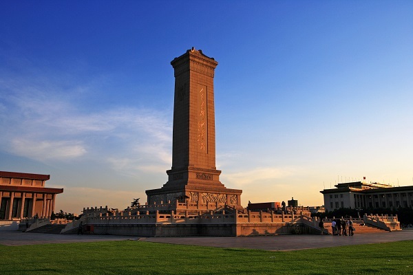 人民英雄纪念碑屹立在天安门广场中心,纪念碑分碑身、须弥座和台基三个部分。其中,纪念碑碑身正面镌刻着毛泽东题写的“人民英雄永垂不朽”八个镏金大字,背面镌刻着由毛泽东起草、周恩来题写的碑文,碑文全文如下: