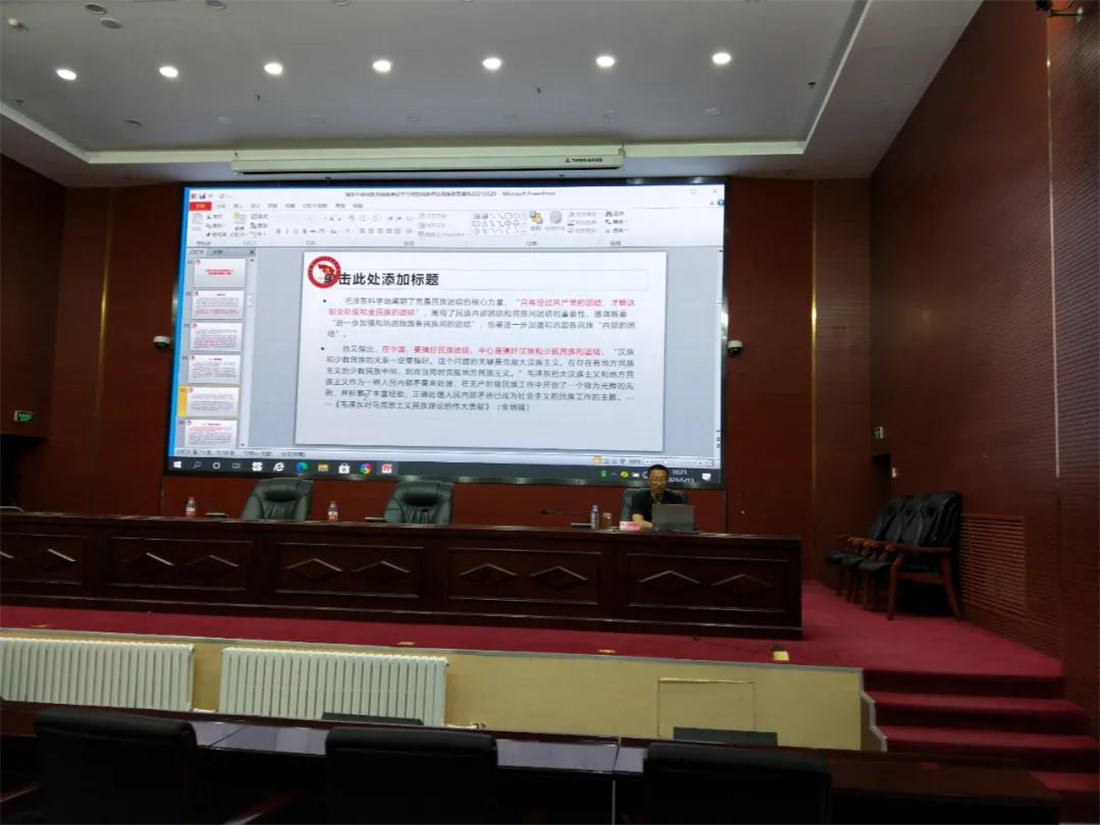 在铸牢中华民族共同体意识专题讲座中,盟委党校副教授刘晓光以《铸牢中华民族共同体意识—学习党的民族理论民族政策》为题,从内蒙古的定位、毛泽东同志对马克思主义民族理论的伟大贡献、党在不同时期的民族理论民族政策、四个共同体和五观教育四个方面,详细讲解了党在不同时期的民族政策和新时代铸牢中华民族共同体意识的重要意义和实践要求,旨在增强盟直机关党员干部维护民族团结进步铸牢中华民族共同体意识的自觉性和坚定性。