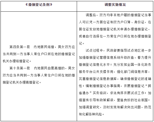 为加快推进政务服务“跨省通办”,满足群众在非户籍地办理婚姻登记的需求,推进婚姻登记制度改革,增强人民群众获得感、幸福感,同意在辽宁省、山东省、广东省、重庆市、四川省实施结婚登记和离婚登记“跨省通办”试点,在江苏省、河南省、湖北省武汉市、陕西省西安市实施结婚登记“跨省通办”试点。在试点地区,相应暂时调整实施《婚姻登记条例》第四条第一款、第十条第一款的有关规定(目录附后)。调整后,双方均非本地户籍的婚姻登记当事人可以凭一方居住证和双方户口簿、身份证,在居住证发放地婚姻登记机关申请办理婚姻登记,或者自行选择在一方常住户口所在地办理婚姻登记。试点期限为2年,自2021年6月1日起至2023年5月31日止。