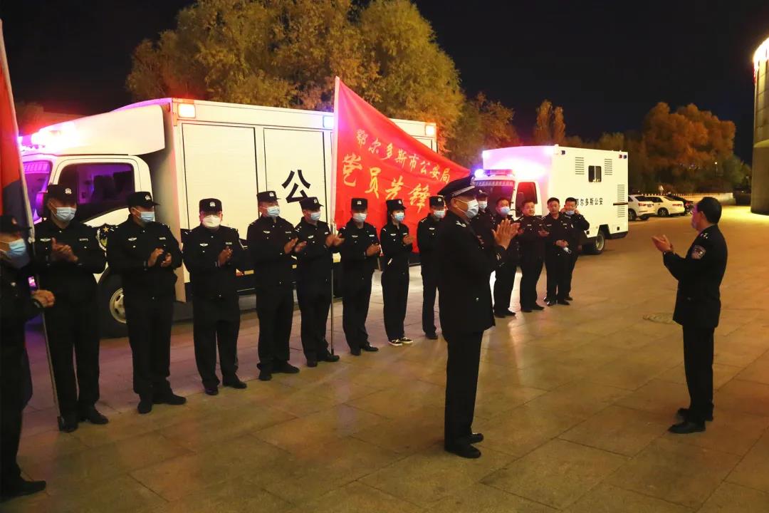 此次支援阿拉善盟,鄂尔多斯市公安局成立由督察审计信访支队雷鸣飞政委任组长,抽调市局机关及鄂旗、鄂前旗、乌审旗公安局共 100 民警组成的支援队伍,共 4 路分头自行出发,统一到阿拉善盟额济纳旗集结。共出动大客车、运兵车、运输车、餐车等共计14 辆,足额配备各类警用装备、医疗物资和疫情防护装备,确保全体参战民警无后顾之忧,全身心投入支援阿拉善盟疫情防控工作。
