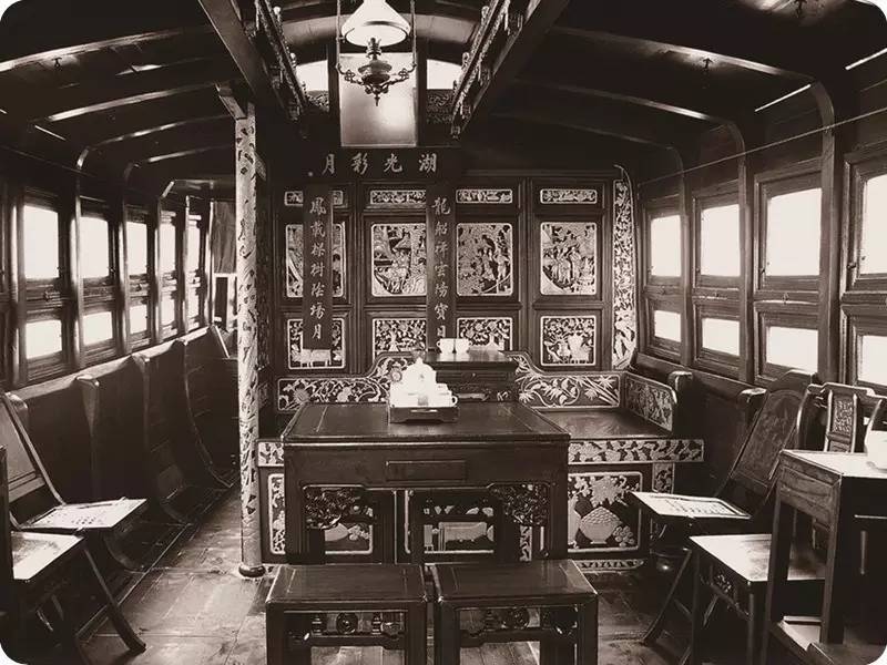 在当时嘉兴南湖湖面上,这种船并不罕见。这是一种单夹弄的丝网船,长约16米,宽3米,有前舱、中舱、房舱、后舱四个部分,当时的南湖会议就是在船的中舱之内进行的。中舱最宽敞,左右两侧有方形玻璃吊窗,装有蓝印花布窗帘。舱中方桌床榻、茶几椅凳,船身花卉、鸟兽等雕花图案为每一位到访者细致还原着“南湖会议”的历史场景。船后还有一尾小拖梢船,这是供船家运送货物和接送客人用的。