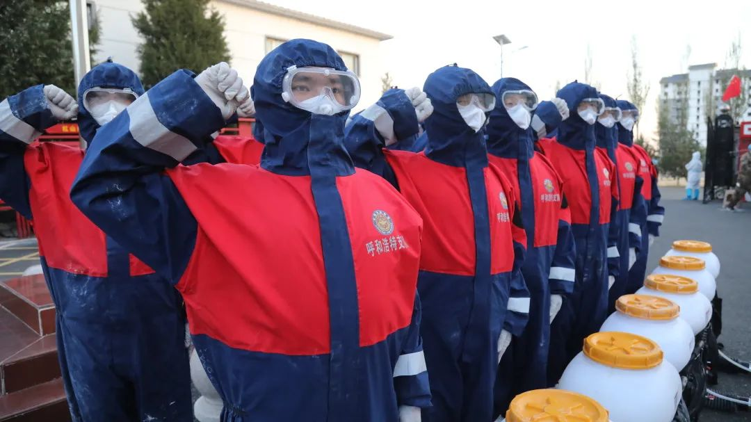 呼和浩特市消防救援指挥中心楼前,20名消防员携带全套疫情消毒消杀设备,整装待发。安静的街面,只有队员们铿锵有力的声音在回荡。截至目前,呼和浩特市消防救援支队抗击疫情先锋队,两个梯队已出动23车206人次,完成任务33次,消毒消杀作业面积17万平方米。