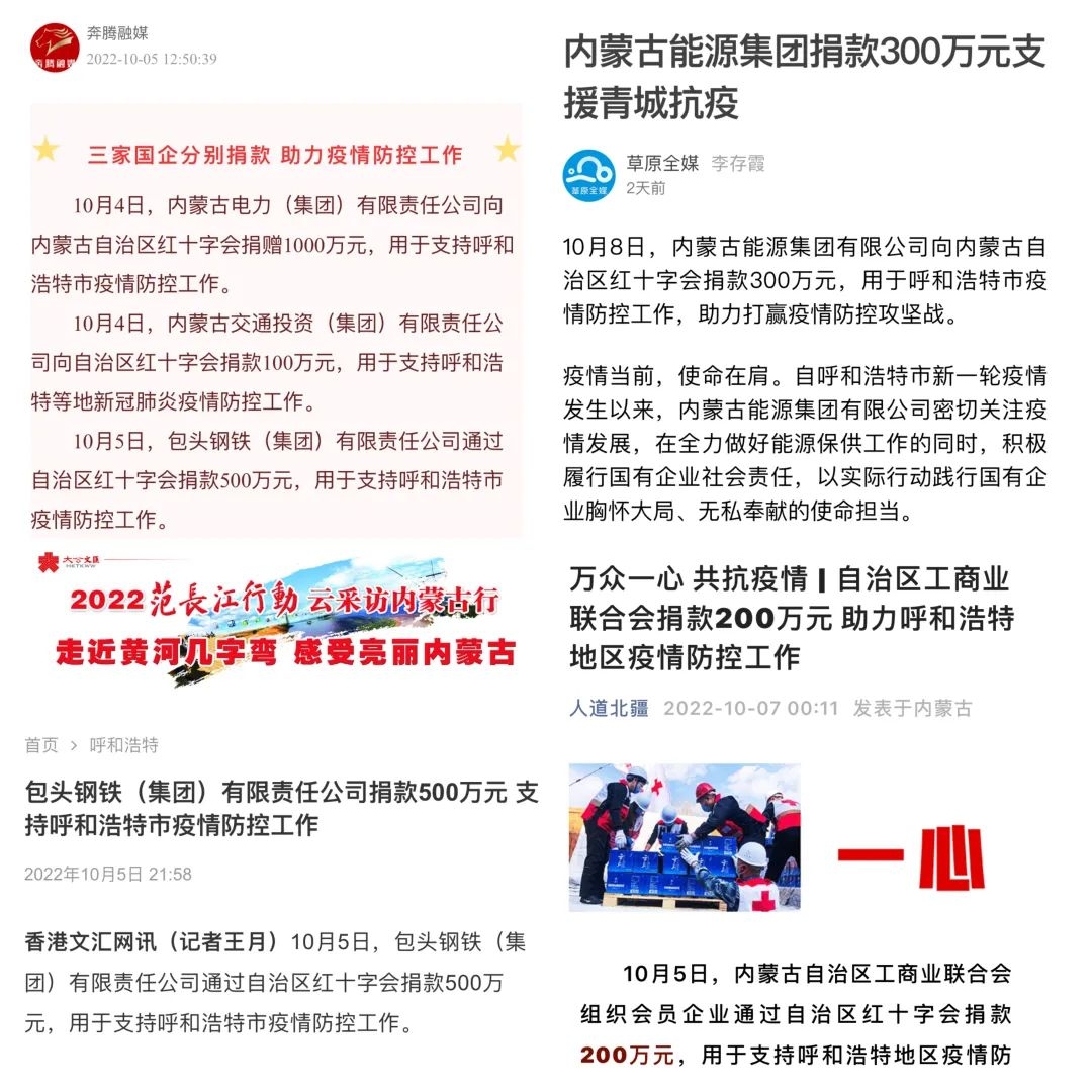 暖胃暖心,助抗疫。紧急采购方便面、自热饭等价值150万元的急需生活物资,及时发放至呼和浩特方舱医院、内蒙古工业大学等疫情防控重点单位,让疫情防控一线人员、志愿者等暖心暖胃。内蒙古大唐药业股份有限公司等企业捐赠的274万元药品,第一时间发往一线,助力打赢疫情防控歼灭战。