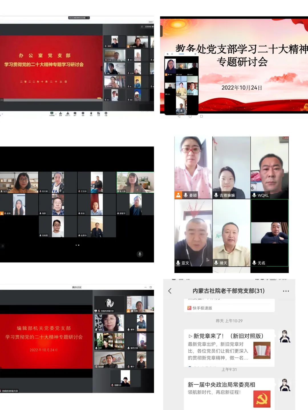 党支部深入学。学院6个党支部按照机关党委部署,开展了线上学习贯彻党的二十大精神专题研讨会,院领导以普通党员身份参加所在支部学习,带头交流研讨、带头宣传阐释,推动党的二十大精神走深走实、见行见效。