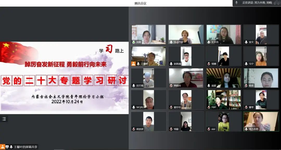 青年干部主动学。青年理论学习小组召开“踔厉奋发新征程,勇毅前行向未来”主题研讨会,热议党的二十大报告,表示作为新时代社院青年,要将个人成长与社院发展、国家发展相结合,把青春奋斗融入党和人民事业,以青春之名,乘风破浪,勇毅前行。