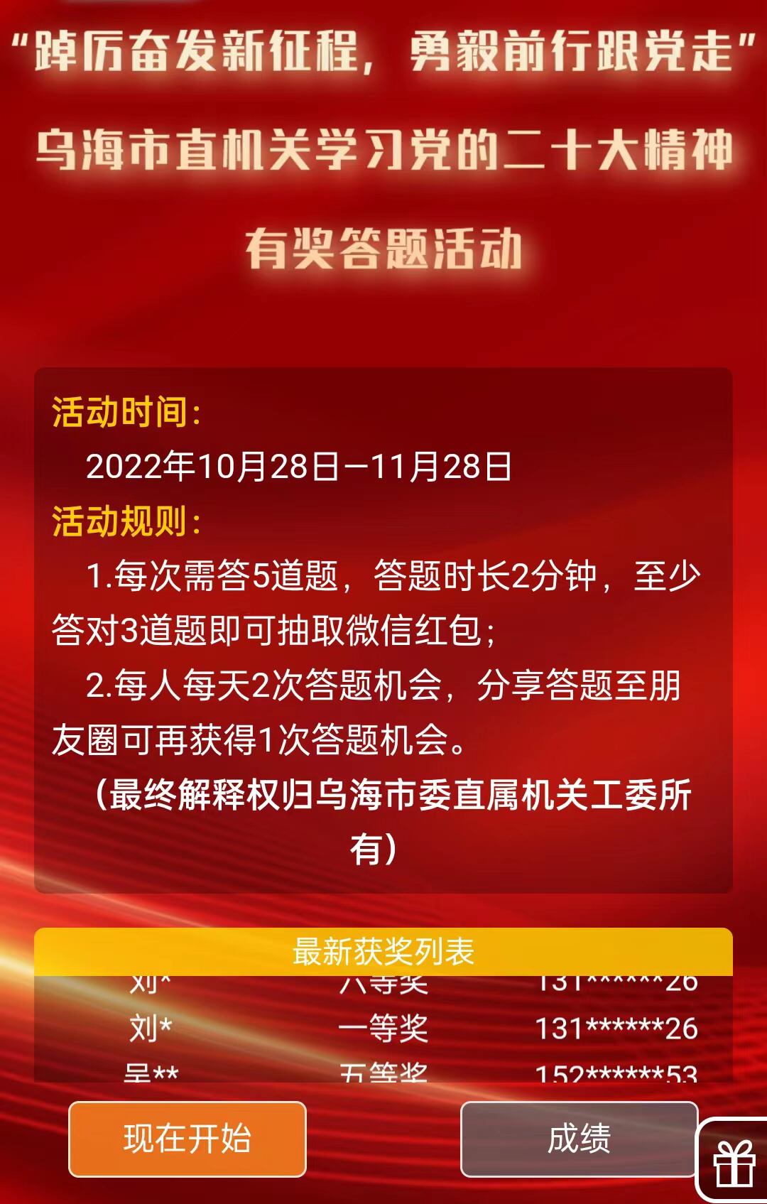 开展网络答题活动。市委直属机关工委创新方式方法,开展以“踔厉奋发新征程 勇毅前行跟党走”为主题的学习党的二十大精神网络答题活动,进一步引导市直机关广大党员在学懂、弄通、做实上下功夫,切实把思想和行动统一到学习宣传贯彻党的二十大精神上来。截止目前,已参与网络答题近万人次。