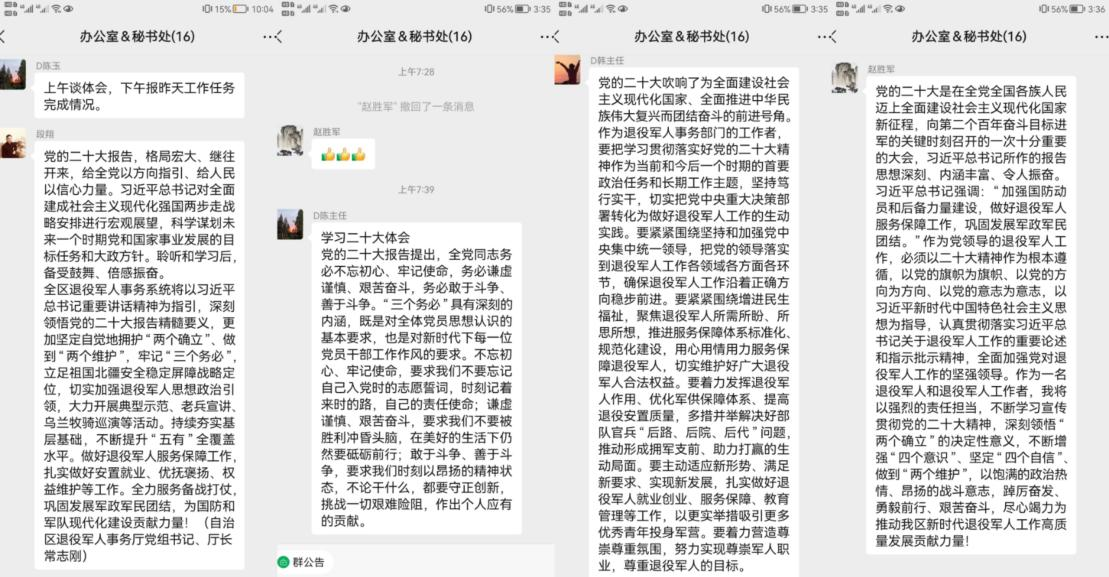 党支部书记、办公室主任陈玉表示:“我们要深入学习贯彻党的二十大精神,站在全新的历史起点,不断推动退役军人工作高质量发展,以全方位精细化高水平的服务保障,努力回应解决好广大退役军人最直接、最现实的利益关切,让退役军人共享社会主义建设辉煌成果,以坚如磐石的军政军民团结,为开创国防和军队现代化新局面,筑牢祖国北疆安全稳定屏障作出应有贡献。”