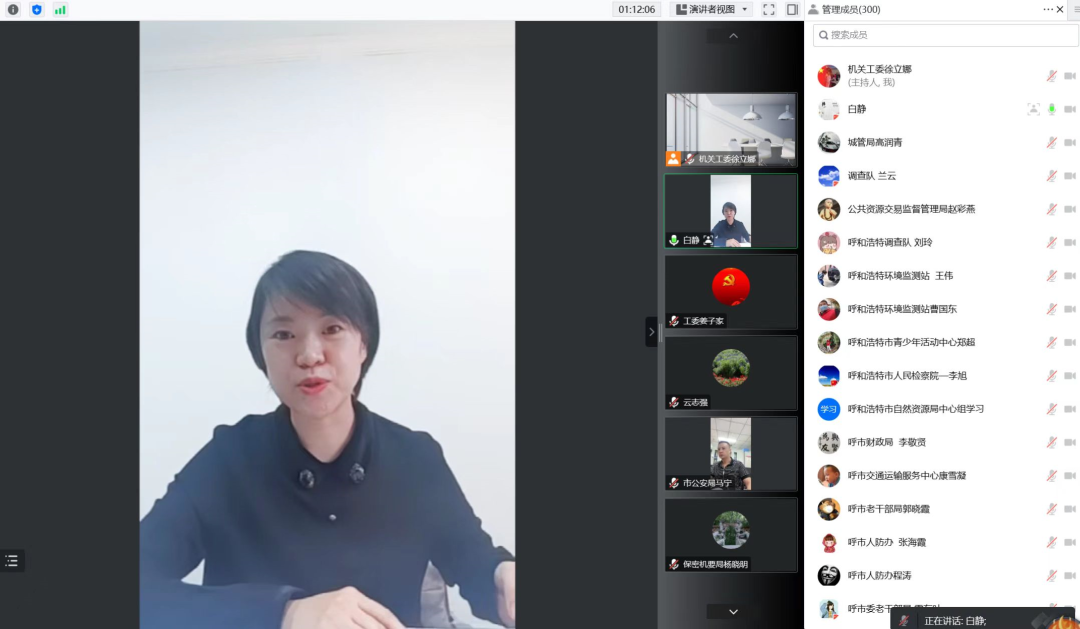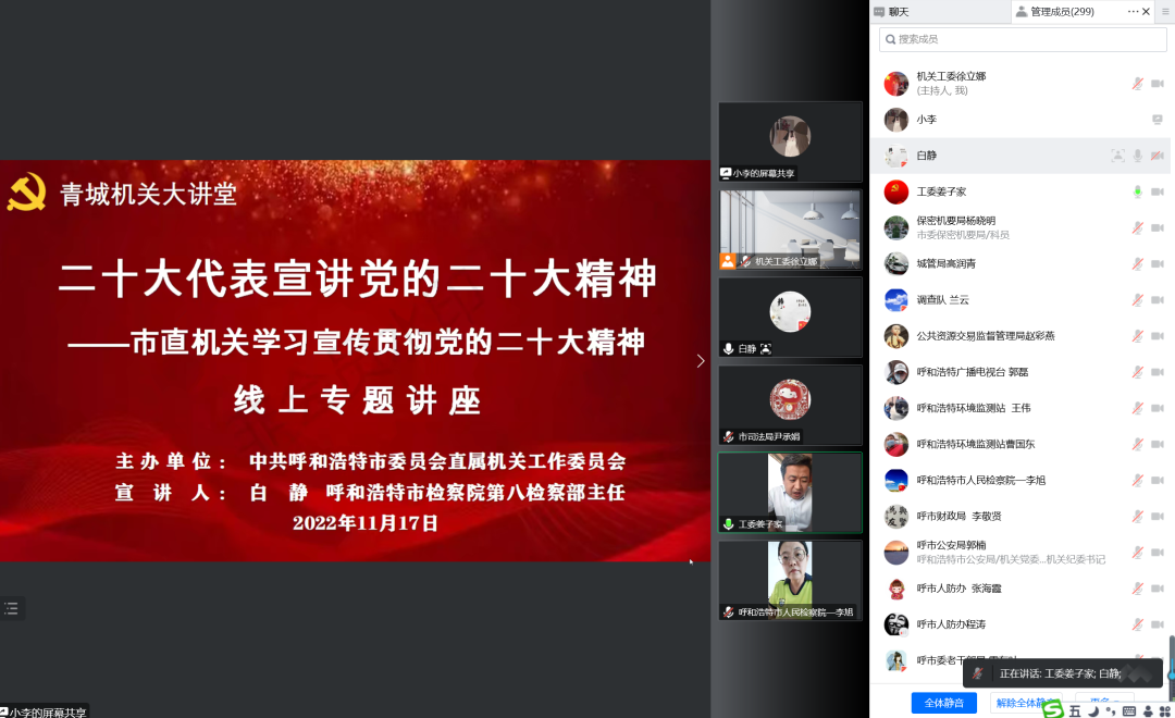 为深入学习宣传贯彻党的二十大精神,11月17日,呼和浩特市委直属机关工委通过视频方式举办“二十大代表宣讲党的二十大精神——市直机关学习宣传贯彻党的二十大精神线上专题讲座”。本次讲座邀请到党的二十大代表白静做题为《以民之所望 作为履职所向》专题宣讲,市直机关专职党务干部、党员代表300人线上聆听讲座。