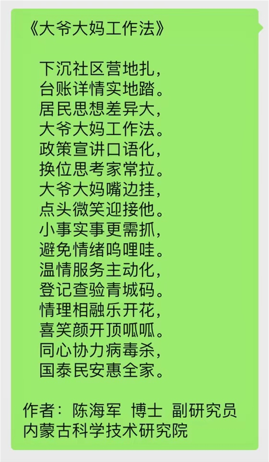 内蒙古科学技术研究院陈海军和白世明两位干部下沉到包联国都世源小区后,针对老旧小区实际,总结下沉实践,总结出《大爷大妈工作法》,将心比心开展群众工作,亲力亲为办实事解难题,得到居民们广泛认可。