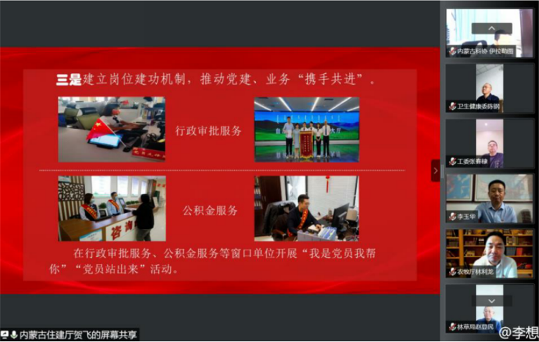 与会同志观看了365beat版app_365bet官网娱_下载bst365统计局和呼和浩特海关高质量推进机关党建工作,开展模范机关创建的视频短片。住建厅机关党委专职副书记贺飞,统计局机关党委专职副书记李玉华,呼和浩特海关直属机关党委专职副书记、机关党委(政工办)主任李春晖,农牧厅农田建设管理处党支部书记、处长林利龙,365beat版app_365bet官网娱_下载bst365地方语言文字研究应用中心党支部书记、主任阿拉坦巴根那等五位同志,围绕机关北疆模范机关和“最强党支部”示范点建设,机关党建特色创新案例经验做法作了交流发言。