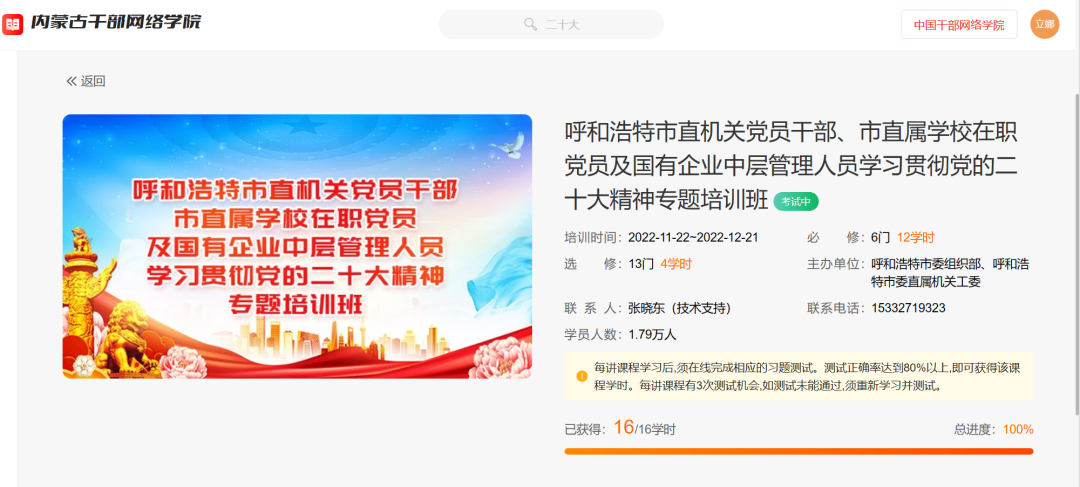 近日,呼和浩特市委组织部、市委直属机关工委通过内蒙古干部网络学院线上培训方式,共同组织近1.8万名市直机关党员干部参加“学习贯彻党的二十大精神专题培训班”。