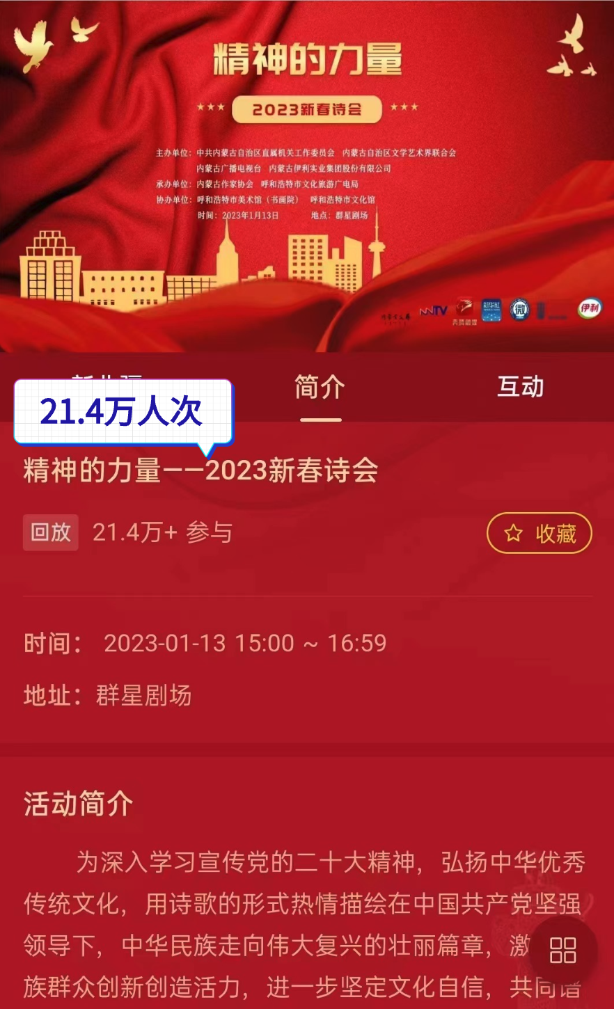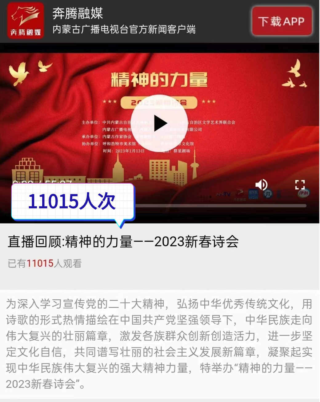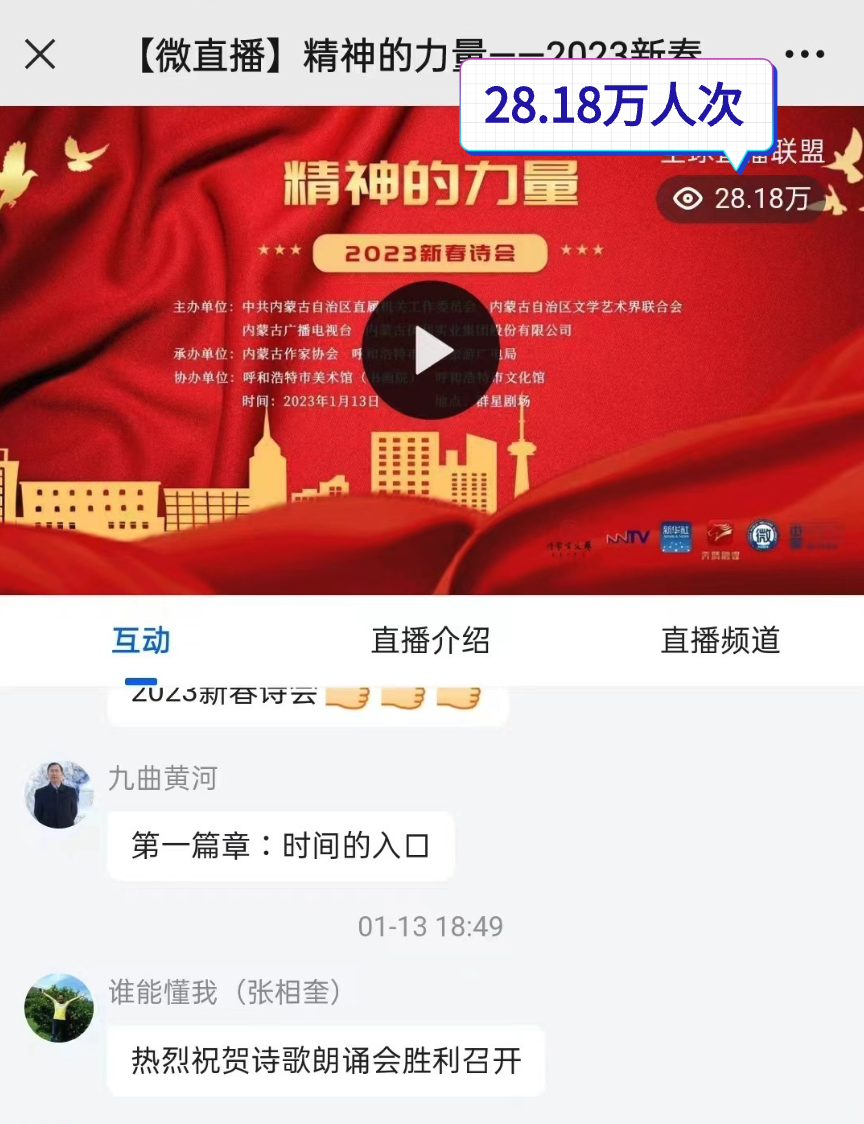 作为内蒙古文联主办的迎新春系列文艺活动,本次诗会既是一场诗意之旅,也是一次精神洗礼 ,诗会紧紧聚焦学习宣传贯彻党的二十大精神,以诗之名,感悟精神的力量,提振信心,共赴梦想的远航,为奋进新征程、礼赞新时代贡献了文艺的力量。