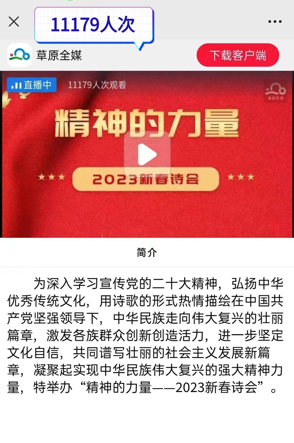 诗会通过内蒙古文艺视频号、奔腾融媒、内蒙古文艺抖音号、全球直播联盟、内蒙古作家协会视频号、草原全媒、大蒙网、新浪内蒙古、新北疆客户端等多家平台同步视频直播,网友纷纷点赞,受到广泛好评。