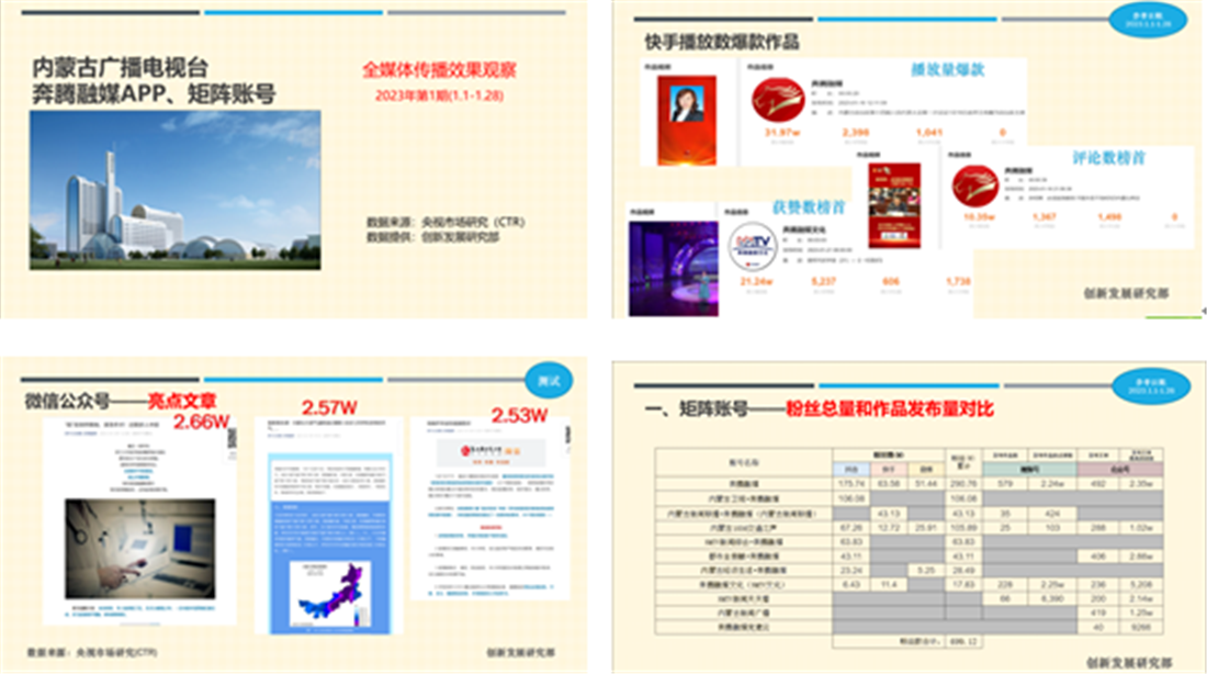 此次座谈交流筛选了内蒙古广播电视台11个相对有影响力的平台账号,分别从微信公众号、微博、抖音、快手和视频号5个平台在全网的实际传播情况进行了对比和汇总分析。